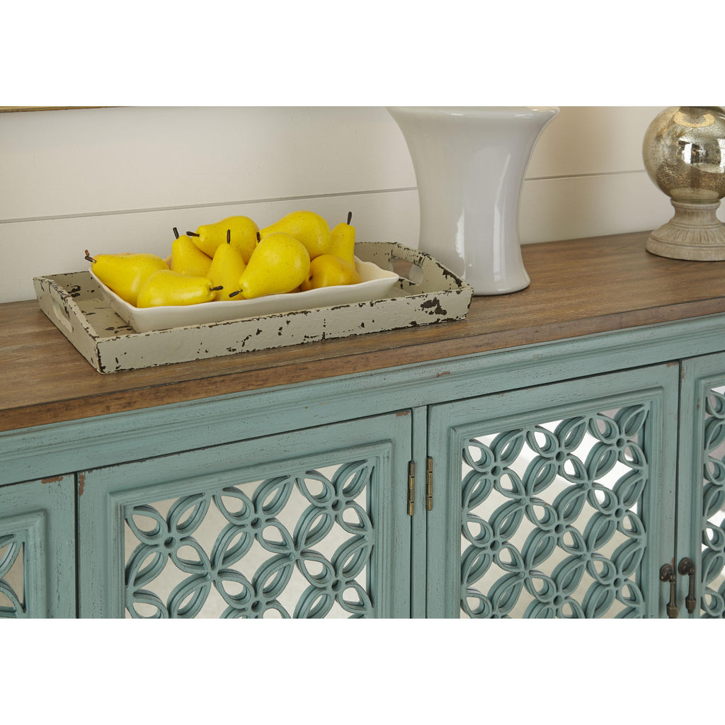 • Turquoise finish with worn wood tone top
