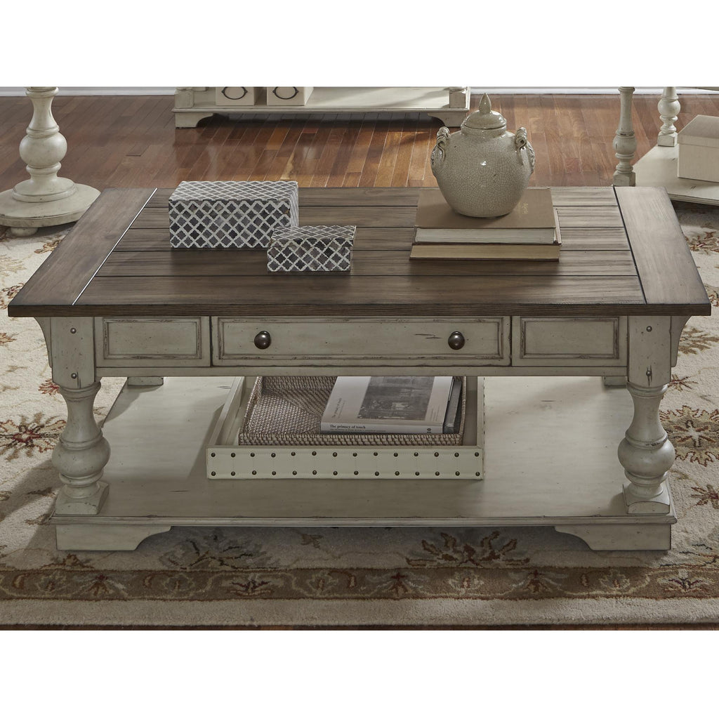 • Antique white finish with wire brushed tobacco tops and accents